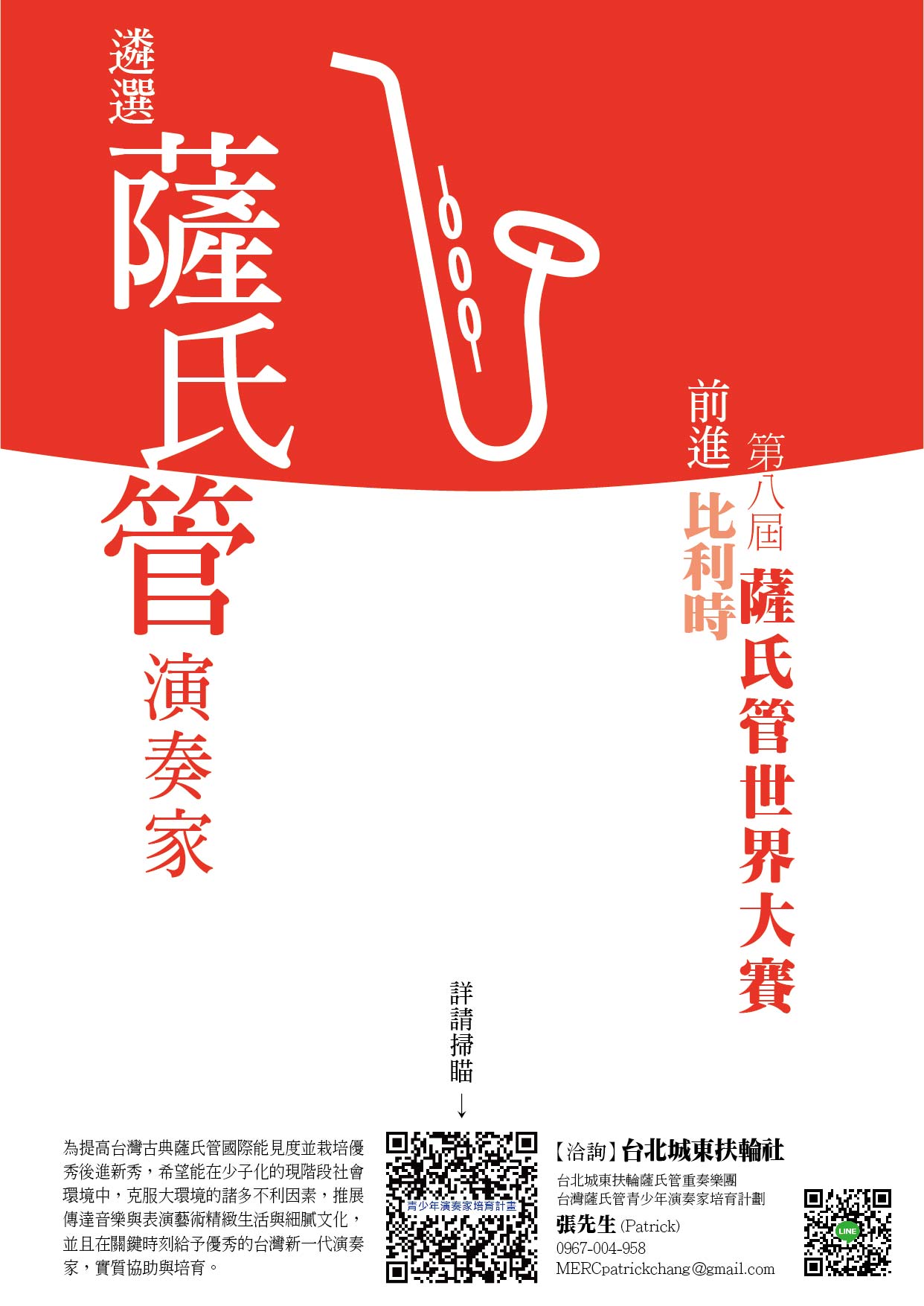 校園公告 公告主旨 台北城東扶輪社主辦「台灣薩氏管青少年演奏家培育計畫-遴選3名臺灣選手參加比利時第8屆薩氏管世界大賽」,請學生踴躍參加。 發佈日期 2021 年 9 月 14 日 發佈單位 學生活動組 公告類別 活動競賽 公告等級 公告 點閱次數 392 公告內容 相關附件 -海報 -海報 檔案名稱檔案大小檔案格式下載薩氏管-海報.jpg176.04 KB新視窗開啟檔案薩氏管-簡介.pdf166.83 KB新視窗開啟檔案 薩氏管-海報.jpg薩氏管-簡介.pdf -報名表 -報名表 檔案名稱檔案大小檔案格式下載薩氏管-報名表.pdf140.14 KB新視窗開啟檔案 薩氏管-報名表.pdf 【2021-09-14】臺北市青少年發展處辦理「2021台北青旅行遊記徵件競賽」活動,請 ... 【2021-09-14】110學年度本校招聘臨時特教助理員1名,甄選簡章公告