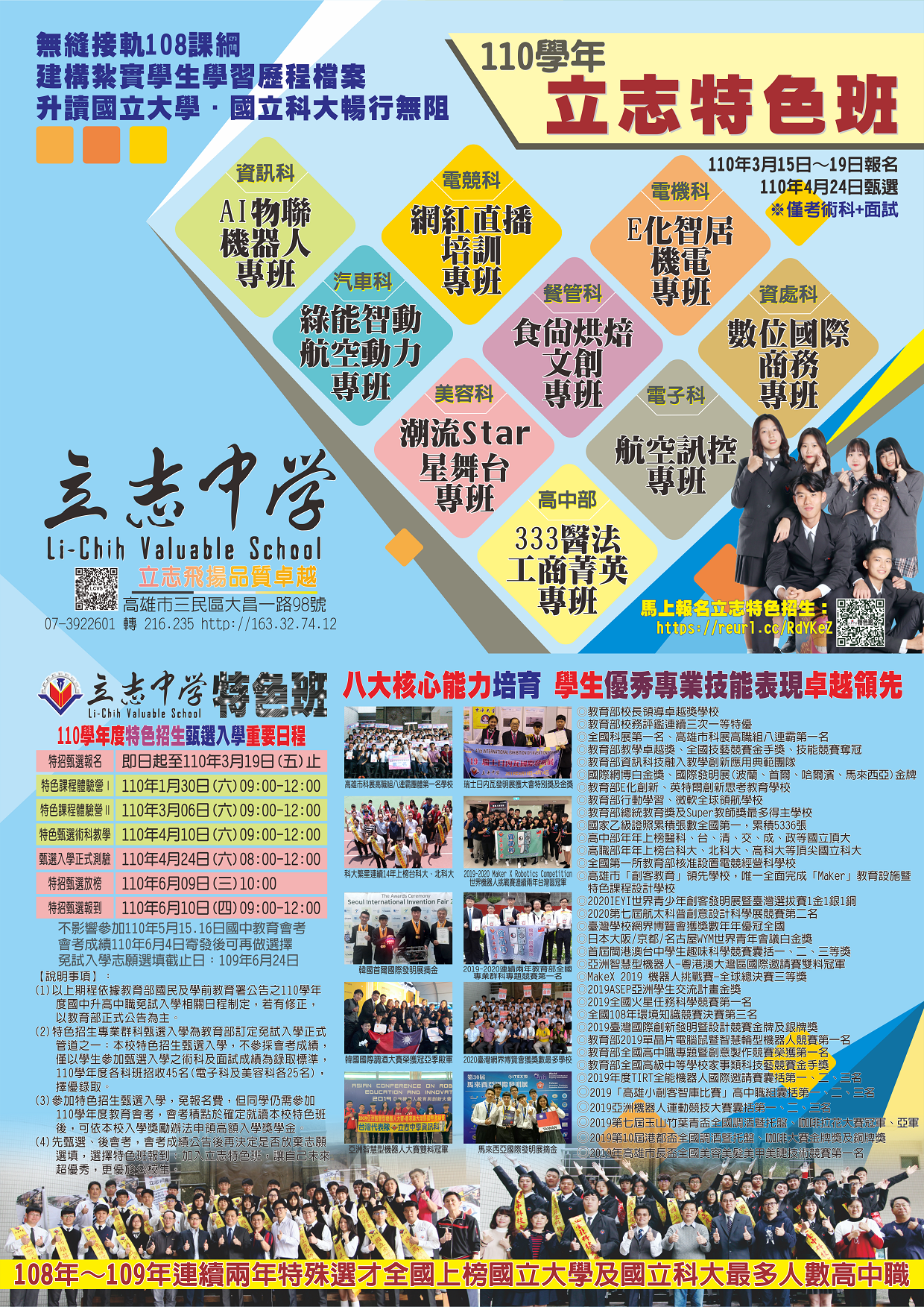 校園公告 公告主旨 立志學校財團法人高雄市立志高級中學招生簡章 發佈日期 2021 年 3 月 17 日 發佈單位 註冊組 公告類別 升學宣導 公告等級 無 點閱次數 1,291 公告內容 下載檔案 下載檔案 檔案名稱檔案大小檔案格式下載附件_15994389_11070159600_ATT1.pdf1.27 MB新視窗開啟檔案 附件_15994389_11070159600_ATT1.pdf 下載檔案 下載檔案 檔案名稱檔案大小檔案格式下載附件_15994389_11070159600_ATT2.png2.53 MB新視窗開啟檔案 附件_15994389_11070159600_ATT2.png 相關附件 【2021-03-17】「臺北市109學年度教育盃中小學壘球錦標賽」競賽規程、報名及防 ... 【2021-03-17】臺北市第6屆原住民族語單詞競賽報名簡章,鼓勵本校原住民學生組 ...