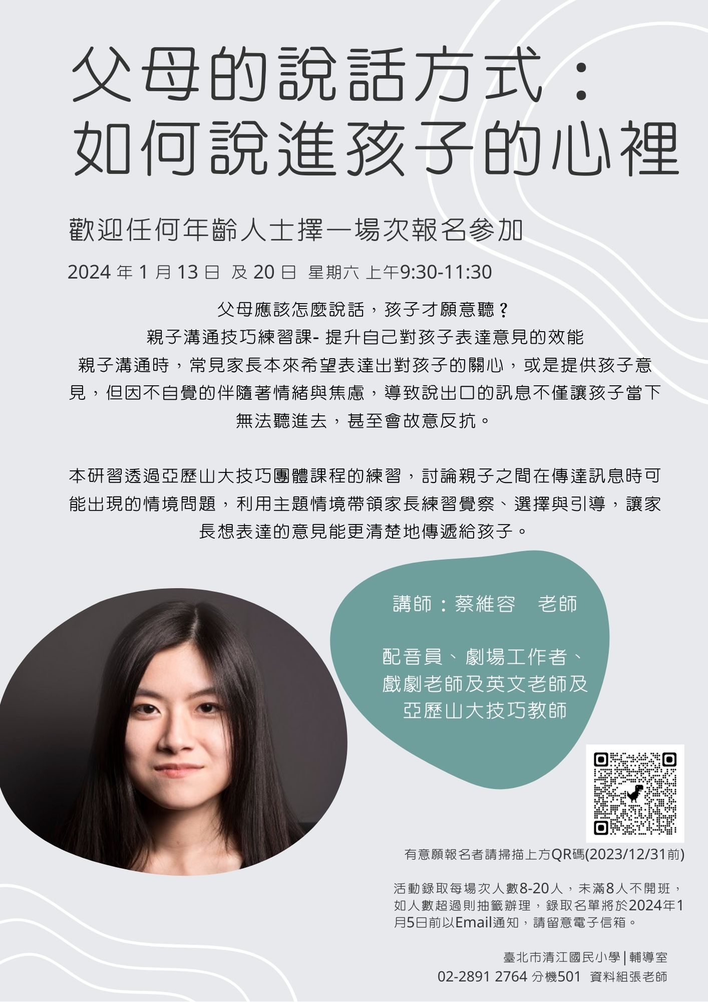 | 公告主旨 | 轉知北市北投區清江國小辦理112學年度親職講座活動訊息,敬請鼓勵參加。 |